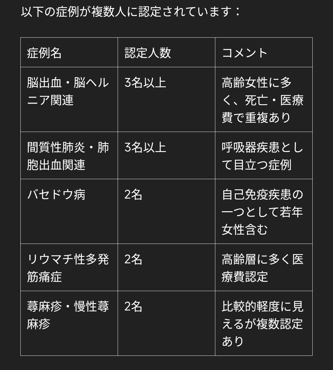 また、間質性肺炎や肺胞出血といった肺の重篤な疾患も複数件認定されました。これらは高齢者に多く、死亡認定にも含まれており、ワクチン接種後の急性悪化が疑われています。