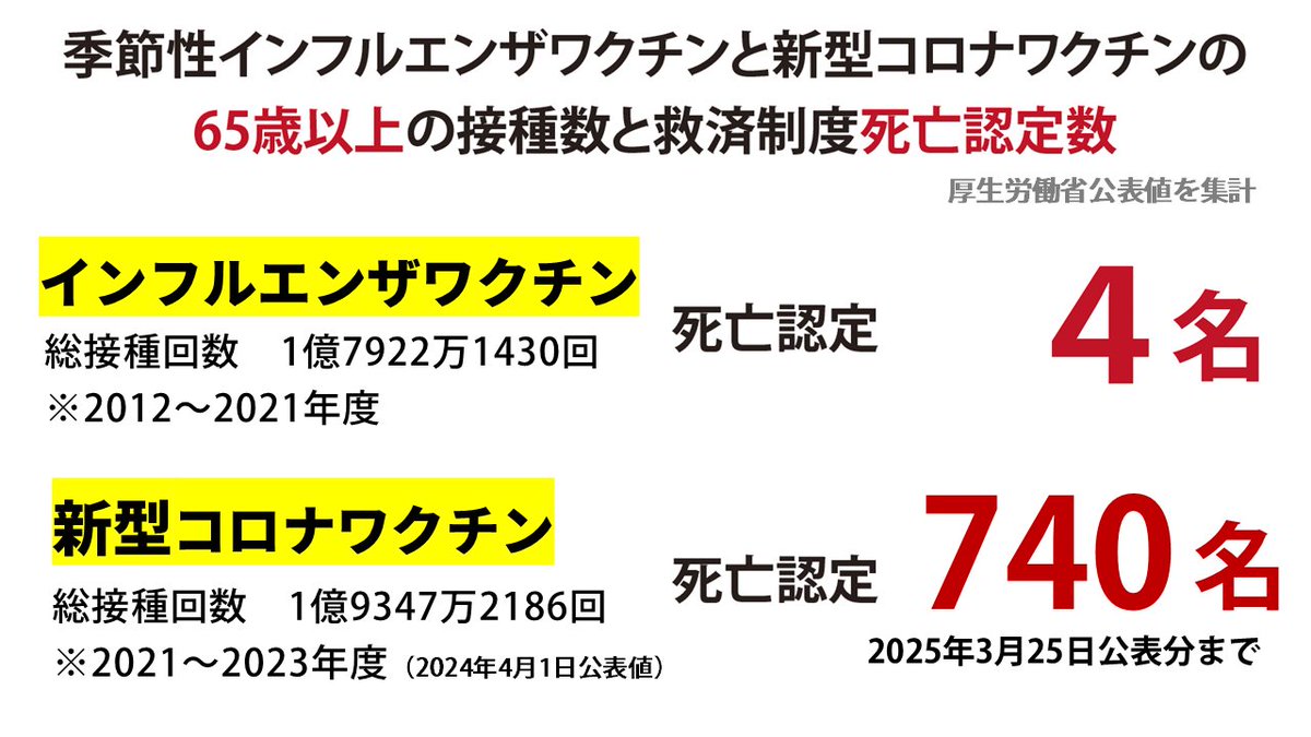 ほぼ条件を揃えてインフルエンザワクチンと比較すると、180倍以上の死亡認定がされています。